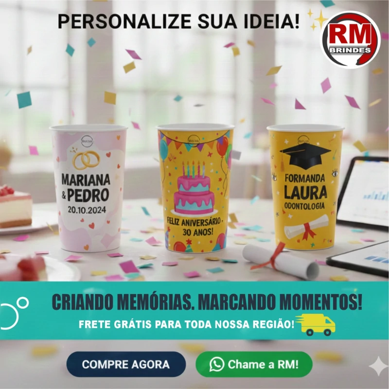Na RM Brindes, você tem total liberdade para criar copos personalizados que combinam com a identidade da sua marca ou o estilo do seu evento. Nossa equipe auxilia em todo o processo de criação, desde a escolha do layout até a aprovação final da arte.